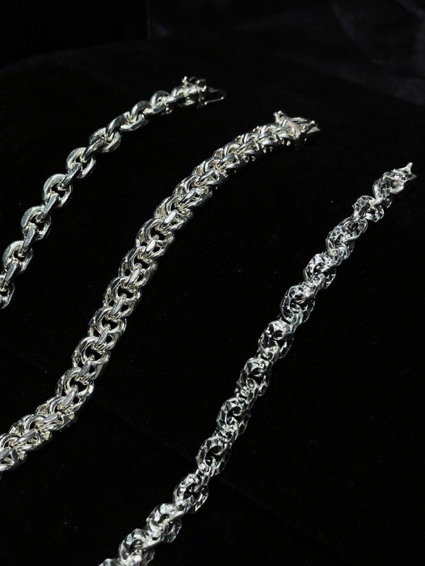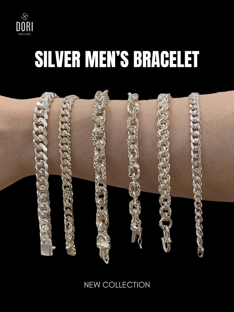 Trang sức cho nam tại Dori xin chào sẽ được làm từ các loại bạc 925, 950, 999 tùy theo mẫu. Một số mẫu sẽ có xi kim giúp sáng đẹp bền màu!